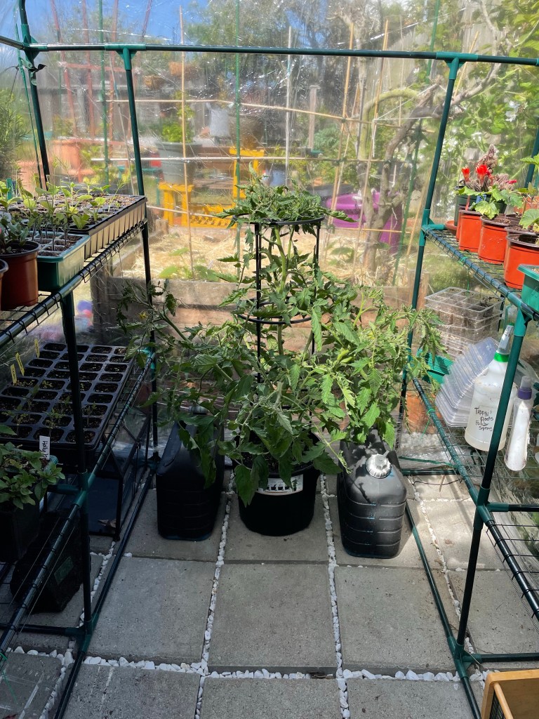 I also top dressed the tomato with some good tomato soil, (when in doubt use a marijuana blend) and gave her some more liquid bloom food. And back into the warm embrace of the greenhouse she goes, until the next set of sunny days.