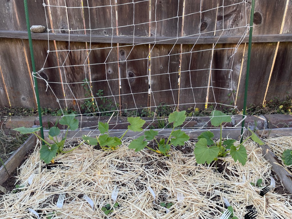 But I’m trying a more delicate and traditional trellising system with my dirani squashes- just some old netting I had and a few stakes. Dirani is a grey type that my dad likes, and I thought I’d grow some for him this year.