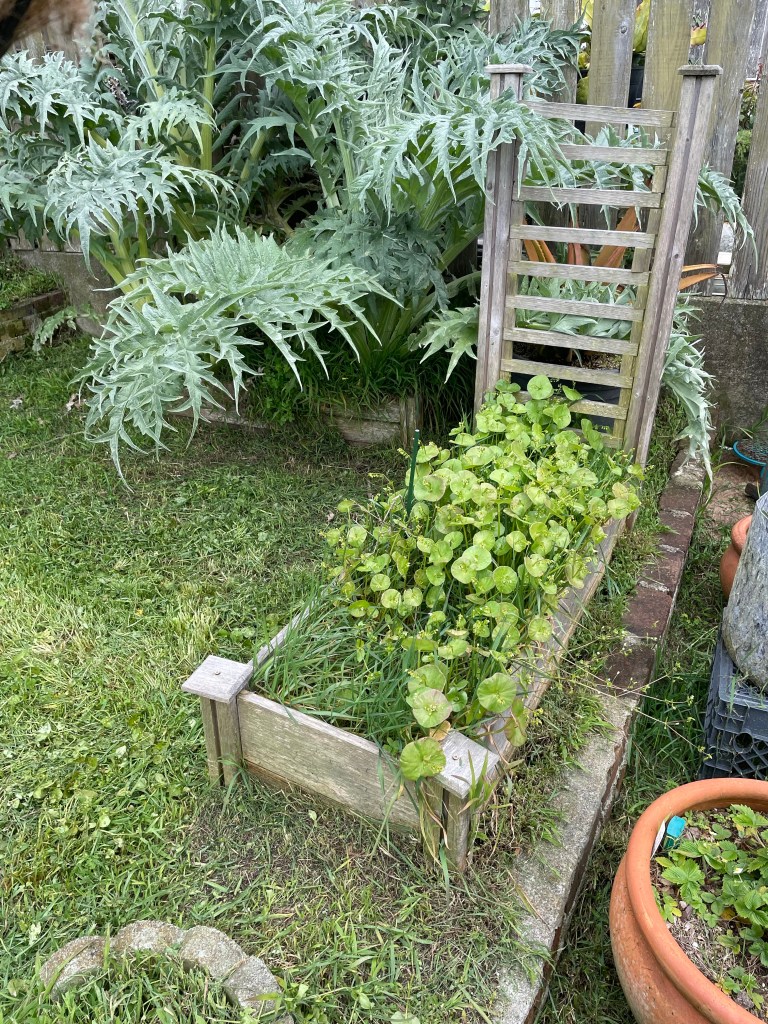 The good news and the good “weed” is the profusion of miner’s lettuce. I made the mistake (or good choice) of buying a cultivated miner’s lettuce around 7 years ago for funsies. They grow naturally in the bay area and most of coastal California but my tendency for a little rain in winter to bring out tons of the little guys is certainly because I planted one once and now it’s seeds are just in my soil. A happy little accident, as Bob Ross would say.